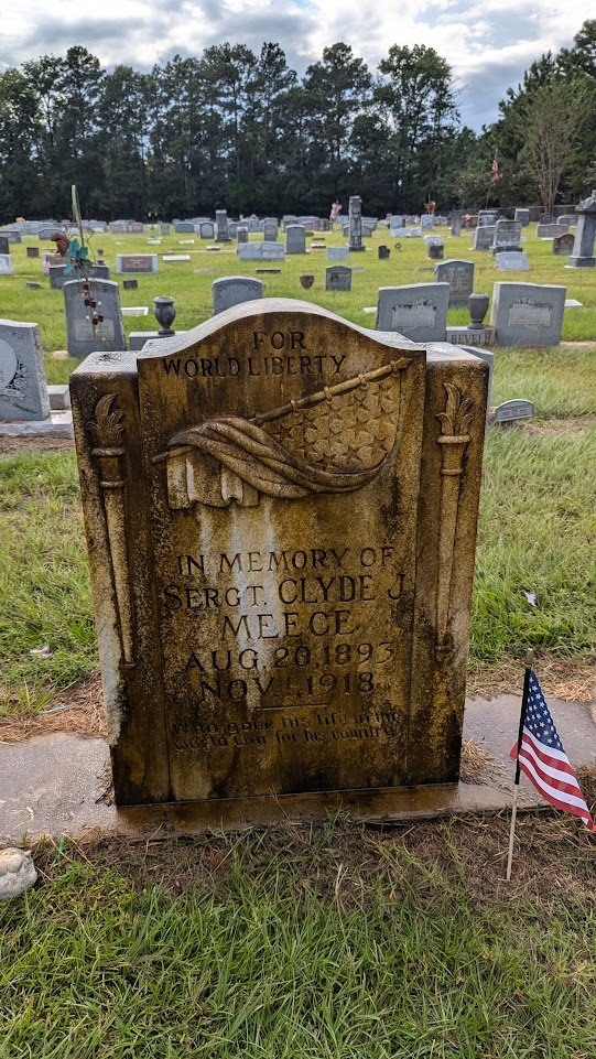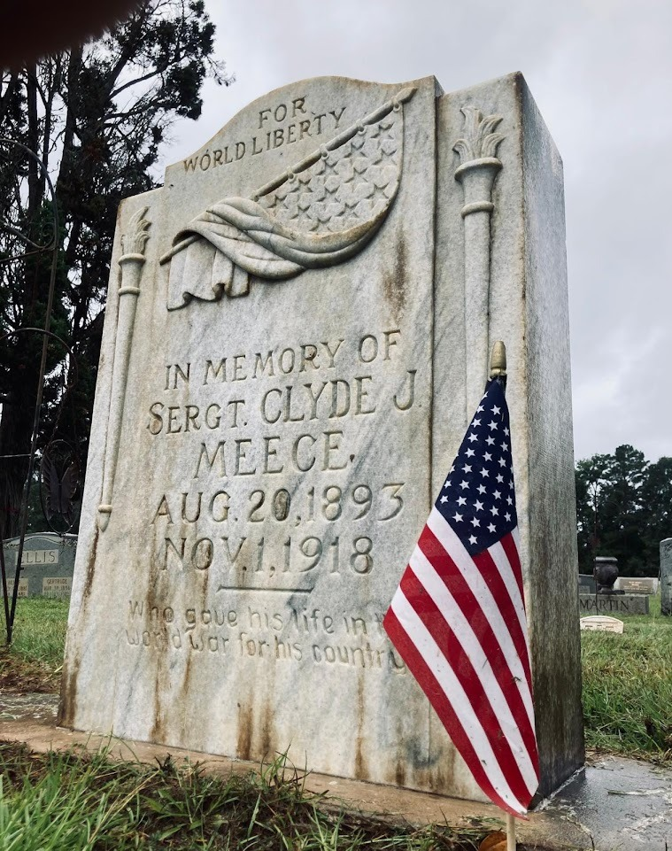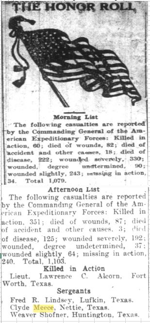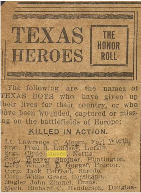 Sergeant Clyde John Meece was reported MIA. His body was never discovered. Dog tags were in use during WW1 so identification of the dead was not an issue. According to the headstone located at Bold Springs Cemetery in Bold Springs, TX, Clyde died on November 1st, 1918. According to the Veterans Administration Master Index and the memorial at Meuse-Argonne American Cemetery in France, Clyde died on November 4th, 1918. Honestly, I don’t think that anyone truly knows when he died. I’ve included two articles reporting his death. One is dated December 7th, 1918, and the other is dated December 12th, 1918.