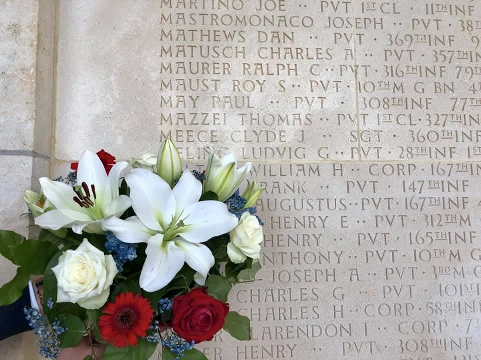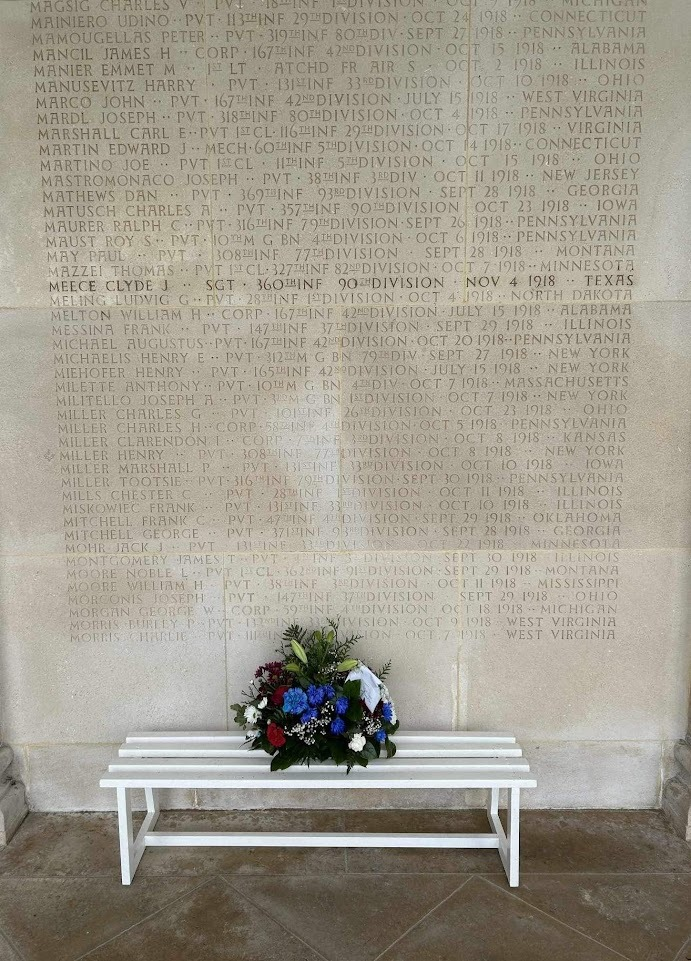 According to Lynda Lee Evans, “my 3rd cousin, a woman by the name of Trish Thomas places flowers at the memorial every year for Clyde. She also places flowers at the grave for her Uncle Claude. Both were killed just days before they were to come home. Both of them were from Livingston, TX. Claude was found but Clyde was MIA”. The Meuse-Argonne American Cemetery, by the way, is absolutely gorgeous. The French should be lauded for the way they memorialized the American dead.