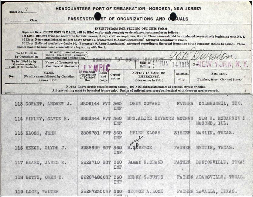 On June 14th, 1918, Clyde boarded the RMS Olympic for transport to, more than likely, Liverpool, England. The majority of the division traveled to England although a few travelled directly to France. The 360th Infantry was sent to Rouvres, France, where the division stayed for six weeks. They trained eight hours a day until they were called to action.
