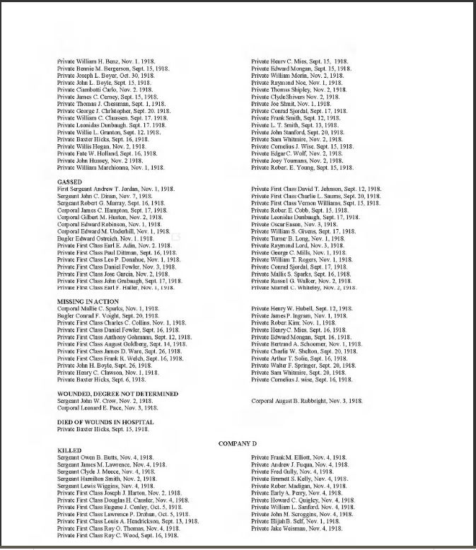 There is practically authentic information in hand showing its battle losses, between September 10 at St. Mihiel and Sedan on November 11 will total, if not exceed, 50 per cent. When our boys come home for the final muster out more than one-half of the old faces will be gone. As our men were shot down their places were taken by others, but the regiment never faltered.