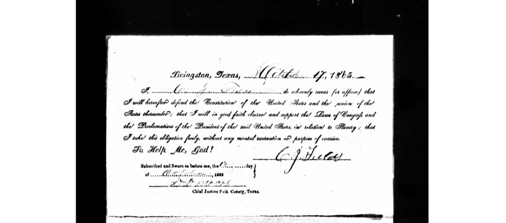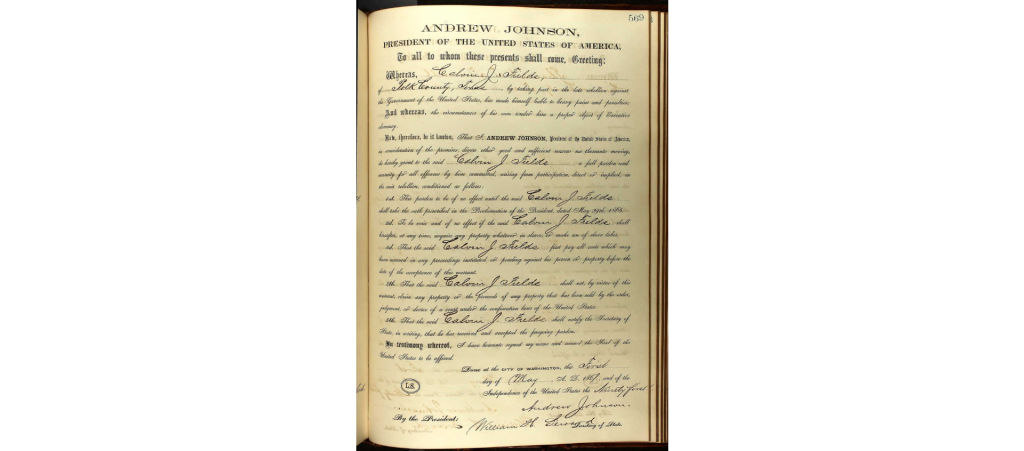 Calvin was a soldier in the Confederacy during the Civil War. I’ve discovered his various U.S. Confederate Applications for Presidential Pardons along with the U.S., Pardons Under Amnesty Proclamations, 1865-1869, signed by President Andrew Johnson. At a later date, Calvin would vouch for or co-sign a loan for William Meece.