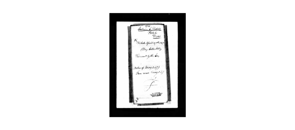 “We started for Texas on Monday the 18 of February 20 we got to Nashville and left there for New Orleans and on thursday night 11 o’clock reached there 28 of feb and we staid until Sunday morning we left there for galveston on tuesday the 4 of march we went to Brothier Williams and staid thier until Thursday 20 we started across the bay we ran aground on the bar and tay there until 23 we then got of and on Friday 28 we laned at swort out on 29 we landed at Brothier Calven Fields”