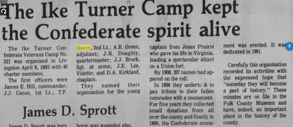 The Ike Turner Confederate Veterans Camp No. 321 was organized in Livingston, TX on April 8th, 1893 with an enrollment of (41) charter members. The first officers were as follows: