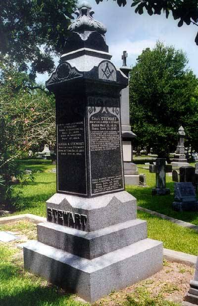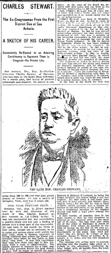In 1866 Stewart moved to Houston where he practiced law. Stewart gained recognition as both a civil and a criminal attorney. He served as Houston city attorney from 1874 to 1876. In 1878 he was elected to the Texas Senate. After one term in the Senate (1879–72), Stewart was elected as a Democrat to the United States Congress, where he served five terms (1883–93). Stewart belonged to various Masonic bodies and in 1883 served as grand master of Masons in Texas. In 1892 he decided against running for office again. He returned to Houston, where he practiced law with his son, John S. Stewart. Following several years of failing health, Stewart died of phthisis (tuberculosis) and diabetes in San Antonio, TX on September 21, 1895. He was only 59 years old. He was laid to rest in Glenwood Cemetery, which is located in Houston, TX. Alas, Charles Stewart would not return for another meeting of the encampment.
