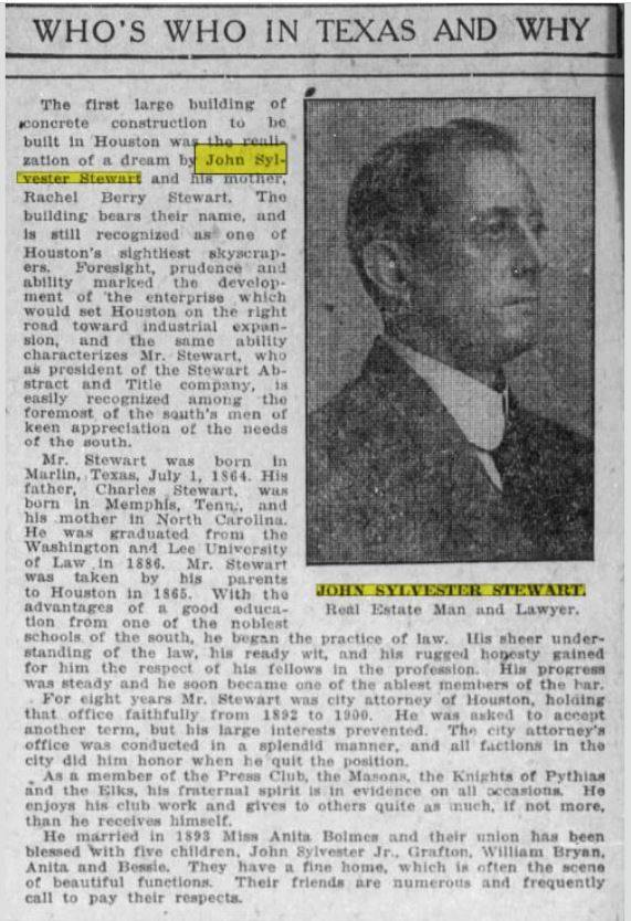 Charles Stewart’s son, John Sylvester Stewart, was highly successful in his own right. The Houston Press Club published “Men of Affairs of Houston and Environs” (“Men of Affairs of Houston and Environs” is the title of a book, specifically a newspaper reference work, that focuses on prominent individuals and institutions in Houston and its surrounding areas.)and wrote this about John: