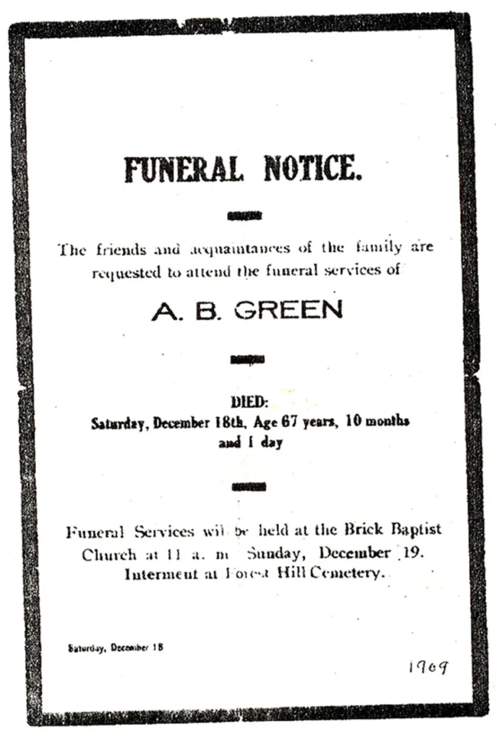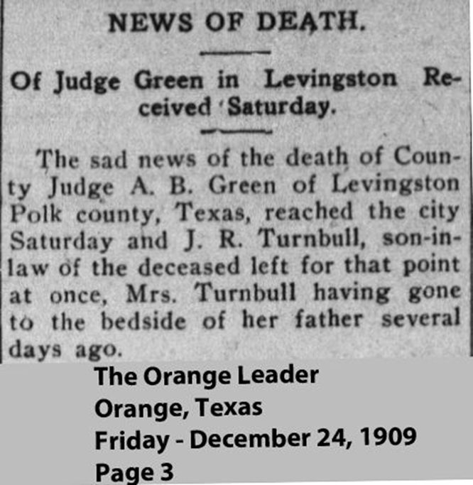 A. B. Green was born in November, 1842; and died at Livingston, Tex, in December, 1909, survived by his wife and six children.