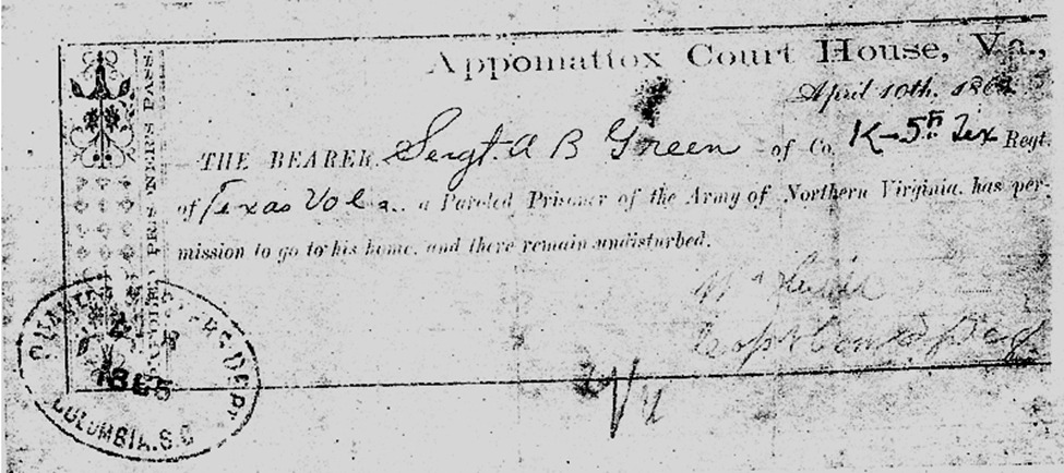 When he was 16 years old, A.B. worked in the store of Patrick & McConnell until 1861 when he and his brother Henry Robert joined Company K, 5th Texas Infantry. Neither they, nor their father, were slave owners. For them, it was their patriotic duty to fight for the State of Texas, the state that their father had helped win its independence. A.B. fought in the battles of Malvern Hill, Seven Pines, Gaines Farm, Manassas, Gettysburg, Chickamauga, Battle of the Wilderness, the Siege of Petersburg, Darbytown, the Siege of Richmond, and he was at the surrender at Appomattox Courthouse. He was wounded four times.