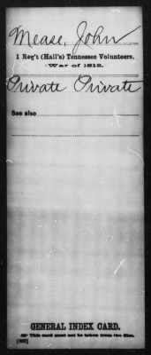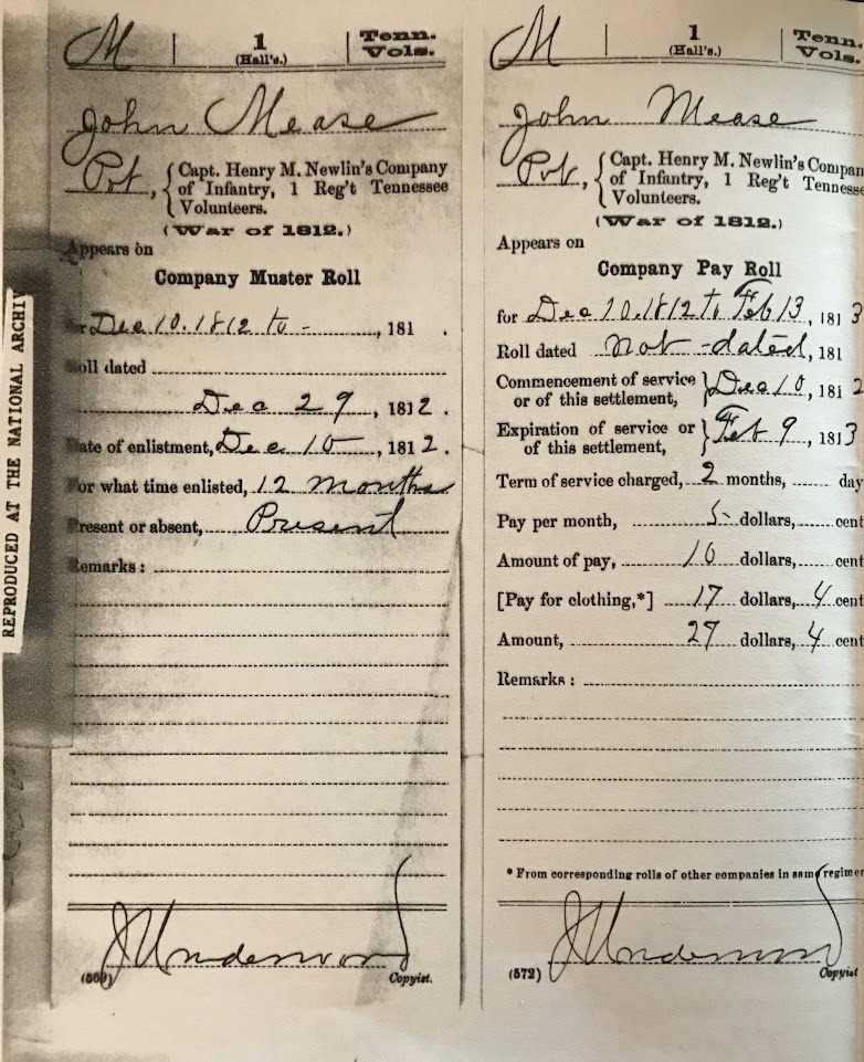 I have attached the Company Muster Roll, Company Payroll and General Index Card for John Meece (Mease). He was in the 1st Regiment (Hall’s) Tennessee Volunteers which denotes Colonel William Hall. His Company Commander was Captain Henry M. Newlin. This corresponds with the Tennessee State Library and Archives Regimental Histories of Tennessee Units during the War of 1812. The date of John’s appointment or enlistment (Dec. 10, 1812) matches the initial date that Jackson set for organizing his troops in Nashville.