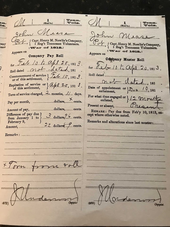Regrettably, she was unable to confirm or deny. Leslie stated that “The Tennessee State Library & Archives has copies of the War of 1812 Muster Rolls on microfilm, but they are in poor condition.” The Payroll Card clearly states REPRODUCED AT THE NATIONAL ARCHIVES and it is signed by a copyist. I’m confident in the story that I’ve produced, although I am not as confident in the identity of John Mease.