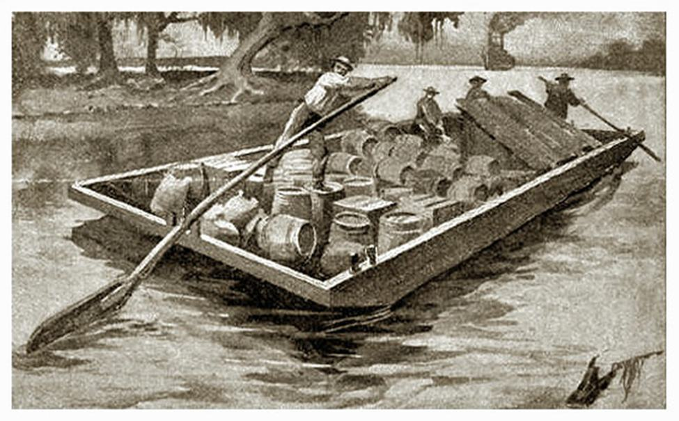 Flatboats were large, rectangular boats with flat bottoms and square ends used to transport people and cargo on the inland waterways in the 1800’s. They were typically 12 to 20 ft. wide and 20 to 100 ft. in length. The flat boats were rigged with 30 to 55 ft. sweeps to guide the boats in the current and a rudder or steering oar. The draught of these types of boats was at most 3’ fully loaded. These boats were designed strictly for one-way downstream travel as they had no means of propulsion. Once they reached their destination they were dismantled and the hardwoods were used for other purposes.