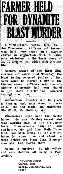 Nettles died from injuries received from a blast of dynamite planted in his cook stove December 19, last year. The state, in conducting the prosecution of the case, introduced testimony to show that Zimmerman had placed two sticks of dynamite in the flue of the Nettles’ home on the night before the explosion. Zimmerman received the verdict calmly.
