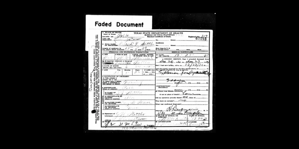 In the 1920 census, he was 45 years of age. Carl Franklin, Elizabeth and Ella were added to the brood. He lived on Kiam Road in Livingston, TX, and owned a farm that carried a mortgage. According to the 1930 census, his family lived at 538 Seventh Street in Port Arthur, TX. The household did not have a radio. He was still listed as a farmer, and he rented his home. The rent was $60.00 per month or $959.00 annually. In the 1930 census, he was 55 years old.