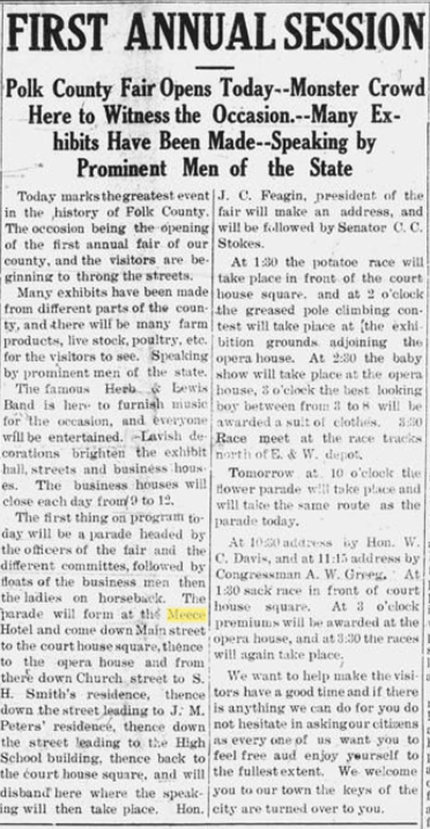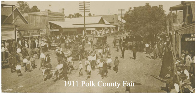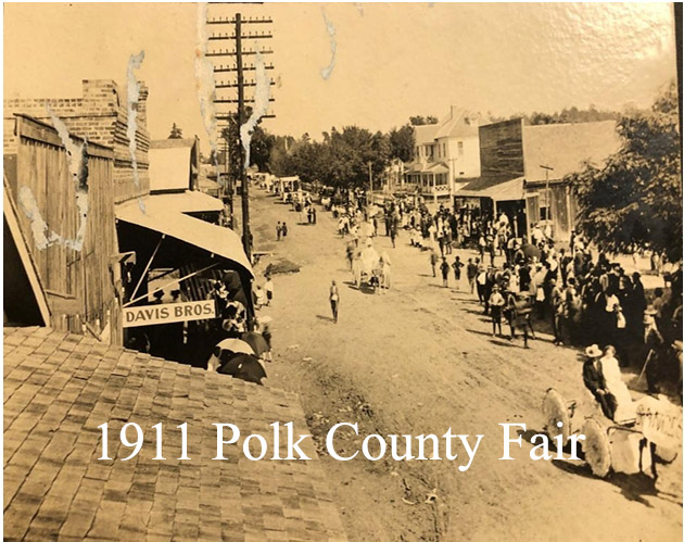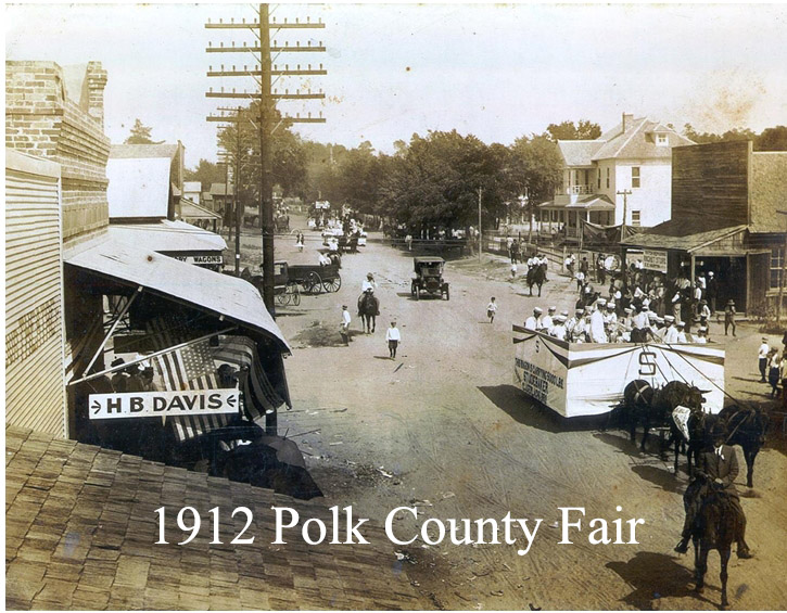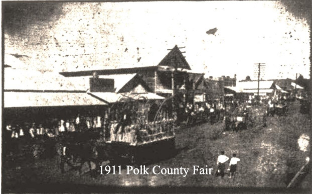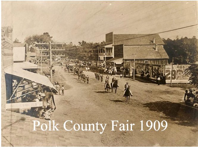 The 1st annual Polk County Fair was held on 10/21/1909. The Meece Hotel was the staging point for the start of the parade. The parade disbanded at the courthouse. I’ve attached photos of the parades from 1909 through 1912.