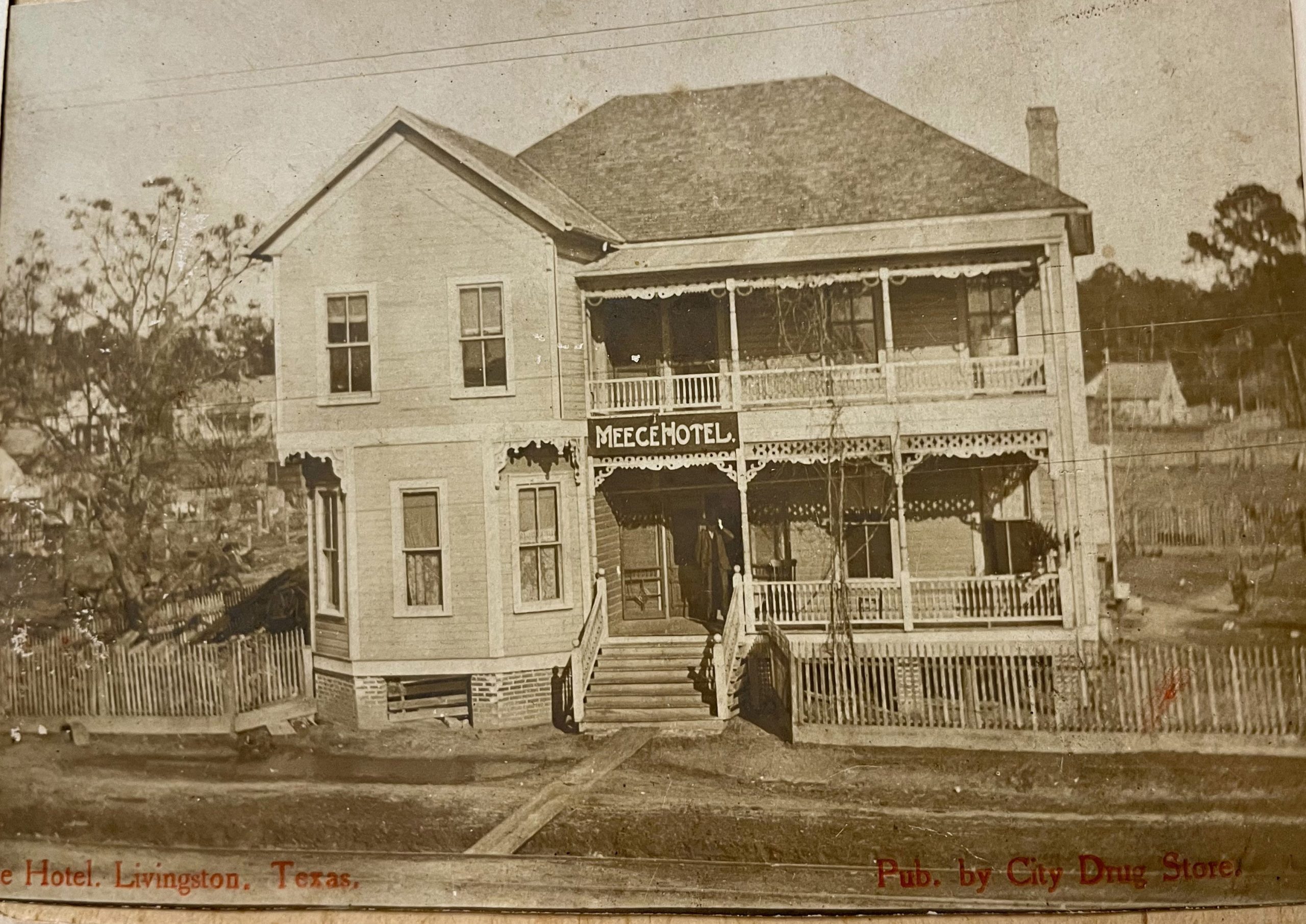 Regular guests of the hotel were charged $2.00 per night which is equivalent to $69.34 today. Quite a bargain! Aside from its regular guests the hotel would operate as a venue for events such as meetings, weddings, correspondent dinners for the Polk County Enterprise, Woodmen of the World meetings (fraternal organization), etc. The lower panel of the screen doors of the Meece Hotel appear to contain replicas of the State of Texas. The individual on the front porch in the photo is unidentified.