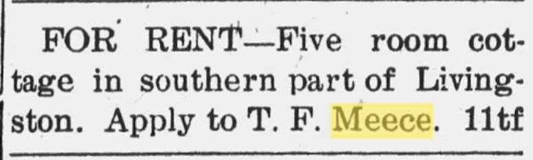T.F. had a five room cottage nearby on Railroad Avenue, in the direction of Livingston. Railroad Avenue was adjacent and parallel to the railroad tracks. It can be seen on the 1935 Sanborn Insurance map. To my knowledge, the road no longer exists. According to the attached article, T.F. and his partner Joseph Lee Manry constructed “new and elegant cottages” on Block #1.