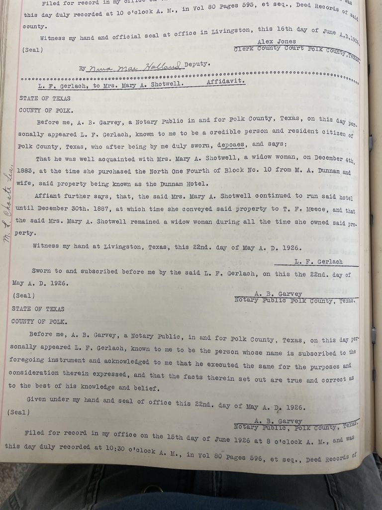The Dunnam Hotel was built sometime around 1880, shortly after the Houston East & West Texas Railway (HE&WT) arrived in Livingston, TX. Construction of the railroad began in 1876. It is believed that a gentleman by the name of Montalvan Adolphus Dunnam built the hotel. Letitia A. Dunnam, his wife, purchased Lot 9 on the N/E Corner of Block 10 from W.J. Brown and his wife R.M. Brown for $100.00. M.A. Dunnam was not named in the deed. T.F. Meece was the Polk County Clerk at that time and he administered the deed transaction.