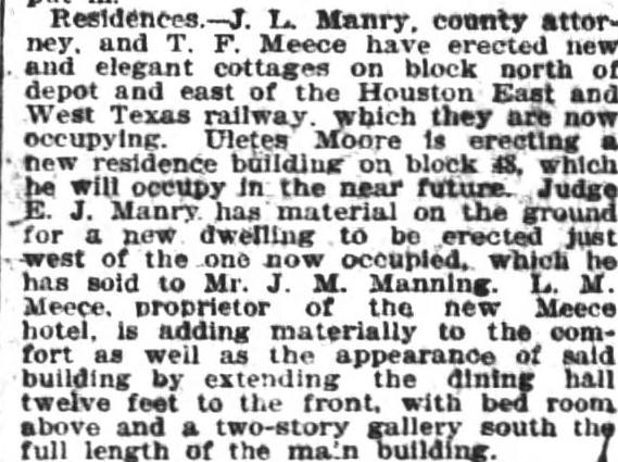 On December 30th, 1887 Mary sold the hotel and property for $650.00 to T.F. Meece, who renamed it the Meece Hotel. Family discount? It was first associated with T.F. Meece in 1888 when a Polk County Newspaper described him as a merchant, land agent and owner of the hotel. T.F.’s first mention of the hotel was in an article in the East Texas Pinery dated 09/15/1892. It was an advertisement under T.F. Meece’s Column. The East Texas Pinery was a weekly newspaper first appearing in 1882 and operating until 1898.
