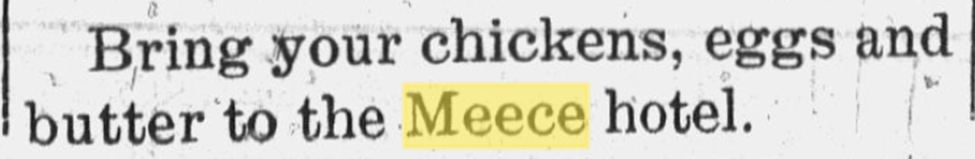• Bring your chickens, eggs and butter to the Meece Hotel.