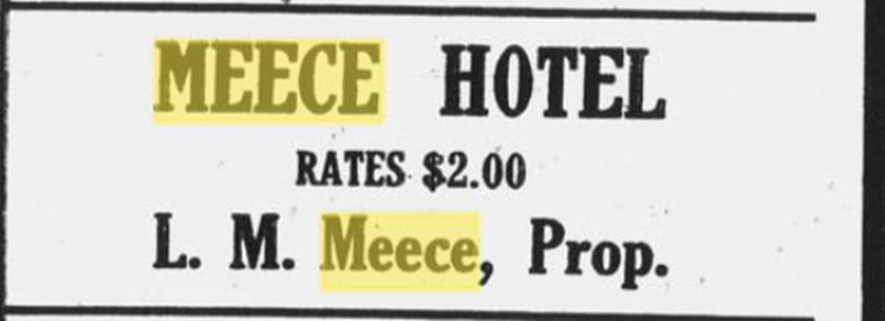 A Doctor Hart used to operate out of the Meece Hotel periodically. He advertised that he could “treat all diseases of the eyes, ears, nose and throat and fit glasses. He has cured hundreds of your neighbors who were blind and led to him. Many were led for years that he gave vision.” Where was this guy when I turned 40? This is my favorite line. “Call at office and investigate and if you can be cured he will guarantee a cure. If you cannot be cured he will frankly tell you so and you will be out no money.”