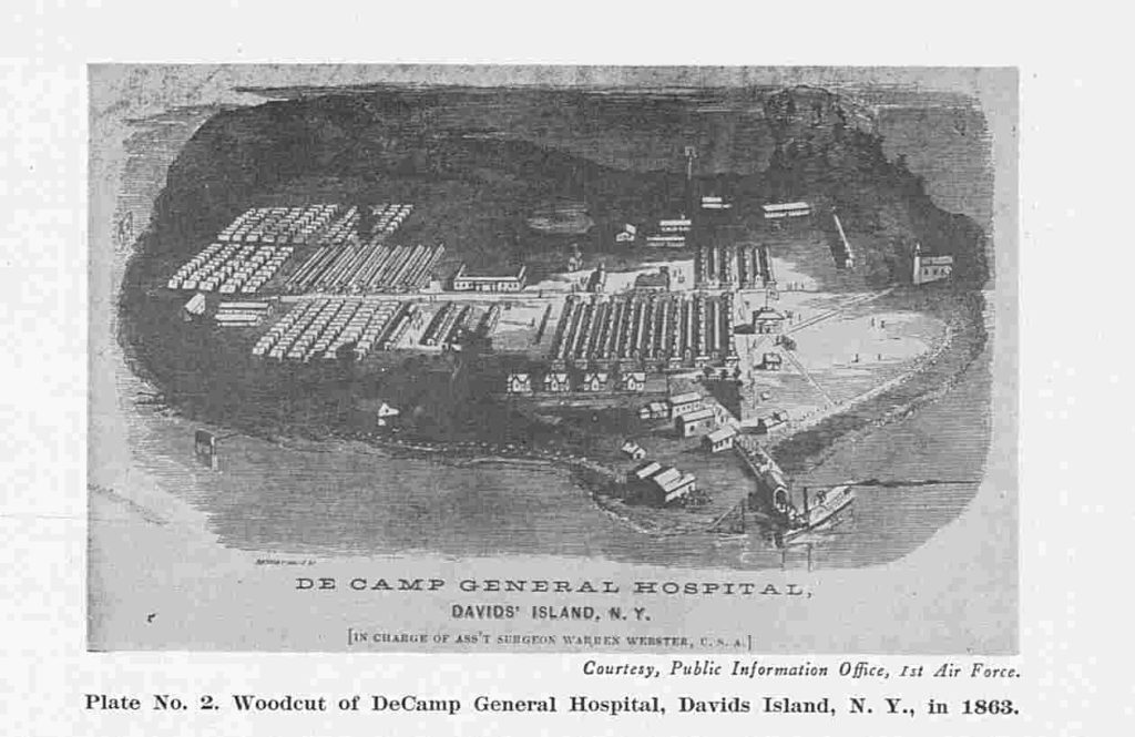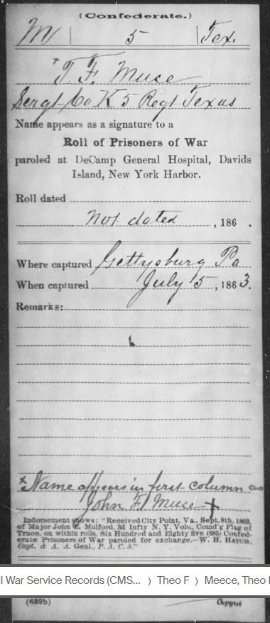 T.F. was sent to David’s Island as a POW on “the forenoon (time period between dawn and noon) of July 21, 1863 from Gettysburg, PA.” David’s Island is located off the coast of New Rochelle, New York in Long Island Sound. Fortunately Theophilus Franklin Meece was released from De Camp General Hospital on David’s Island in New York on Sept. 13th, 1863.