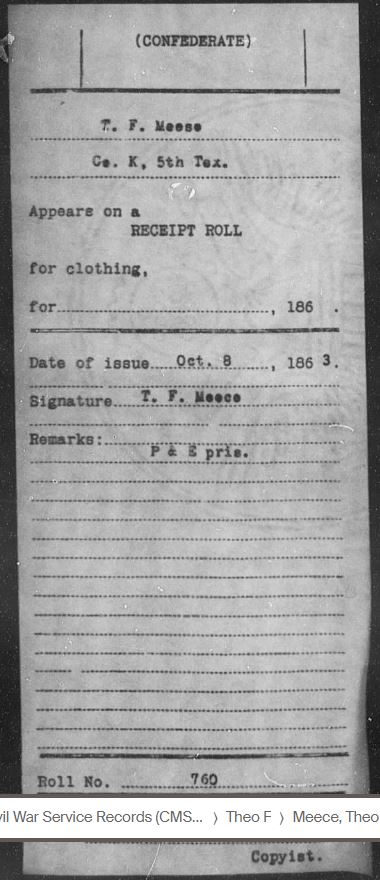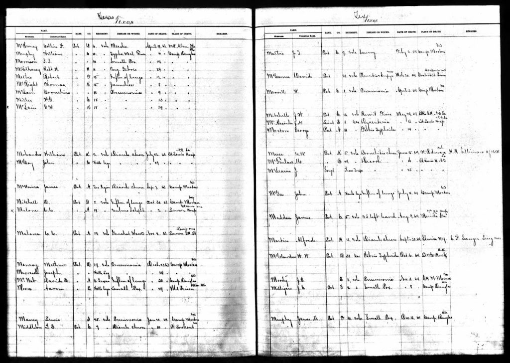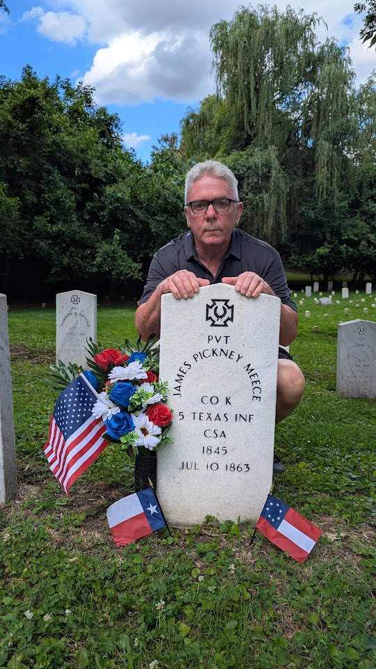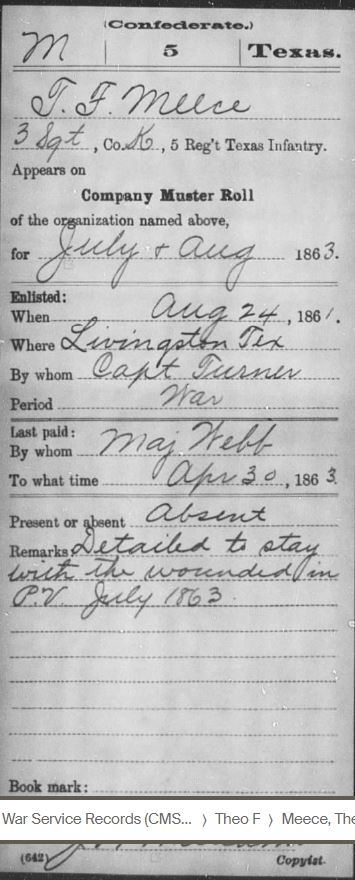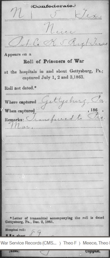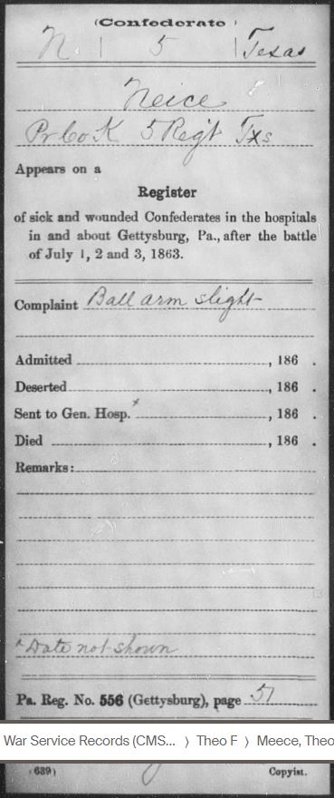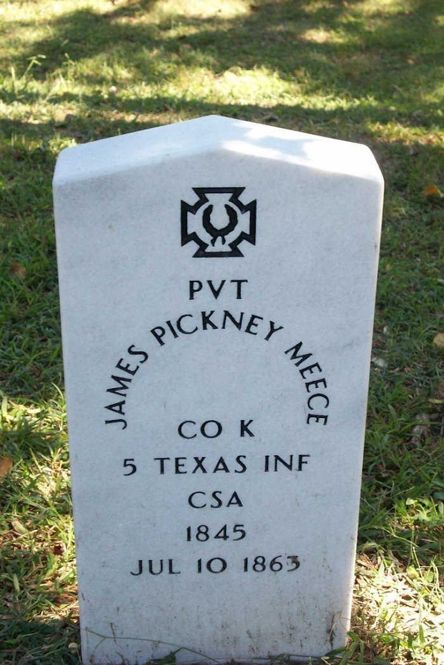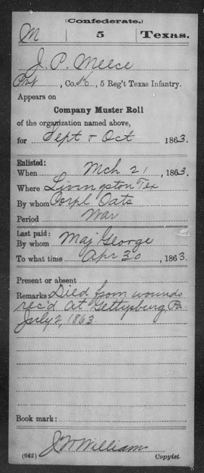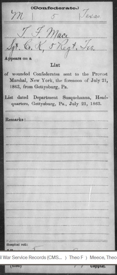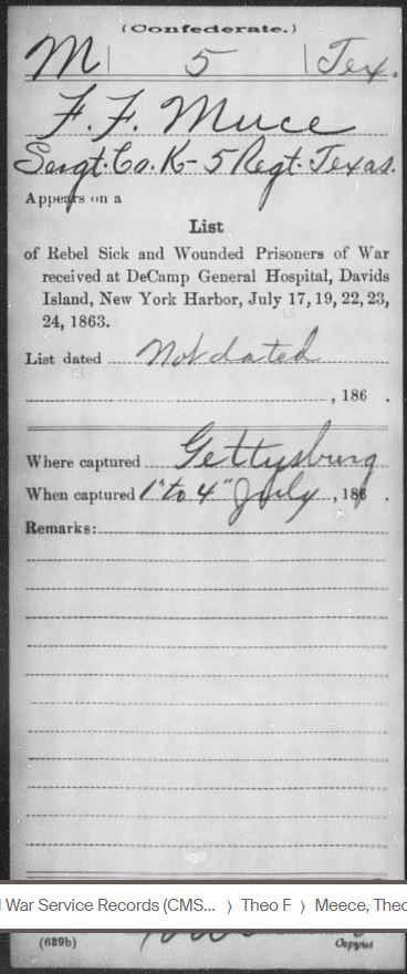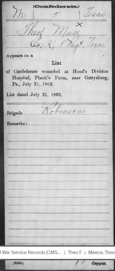 Based on my research, Theophilus Franklin Meece (T.F.) and James Pickney Meece, who was mortally wounded, were both injured at Little Round Top in Gettysburg, PA. Calvin Meece was not injured but he was captured there (educated guess). The fighting was so close and intense that many soldiers found themselves behind enemy lines. T.F. and his brothers were a part of Jerome B. Robertson’s Texas Brigade under General John Bell Hood. Robertson’s brigade sustained losses of 84 killed, 393 wounded, and 120 missing, a total of 597 casualties.