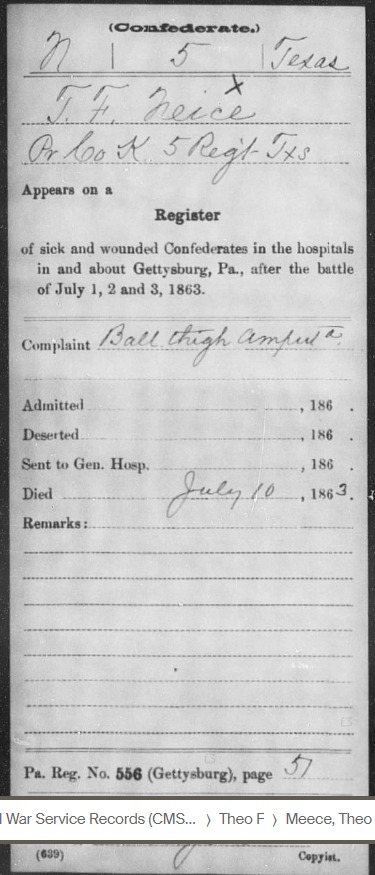 There is one glaring error on one of the cards. “Appears on a Register of sick and wounded Confederates in the hospitals in and about Gettysburg, PA, after the battle of July 1, 2 and 3, 1863.” It describes T.F. as a Private in Co. K. The wound is described as “Ball thigh amputated and it states that he died on July 10th. If anything I think that T.F. was mistaken for his brother John.