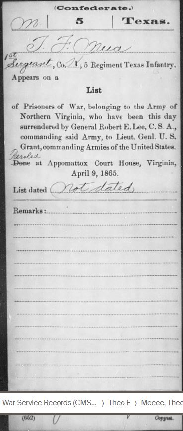 According to T.F. he, “Was never in prison as I was paroled and returned to Richmond to await exchange. Was furloughed and went home where I remained till exchanged in May following.” According to an Indorsement from Grant’s headquarters in City Point, VA T.F. was part of an exchange involving 685 Confederate POW’s paroled for exchange. The terms of the agreement between the two sides sometimes prohibited paroled prisoners from returning to the military in any capacity.