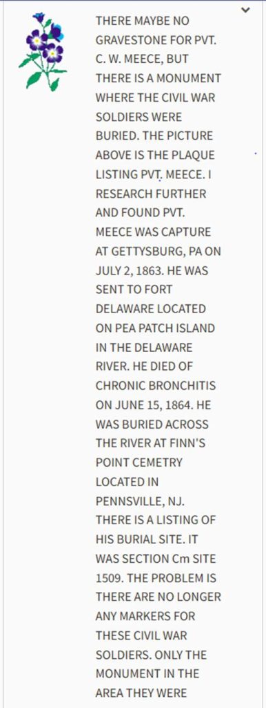 Unfortunately Calvin Wood Meece would not be so lucky. Calvin was sent to Fort Delaware, which was built in 1859 and sits in the middle of the Delaware River on Pea Patch Island across from Finn’s Point National Cemetery. The conditions of the prison were deplorable, and prisoners were afflicted with smallpox, measles, diarrhea, dysentery and scurvy. The prison was set up to house 4,000 prisoners, but by the end of the war, there were over 12,000 inmates.