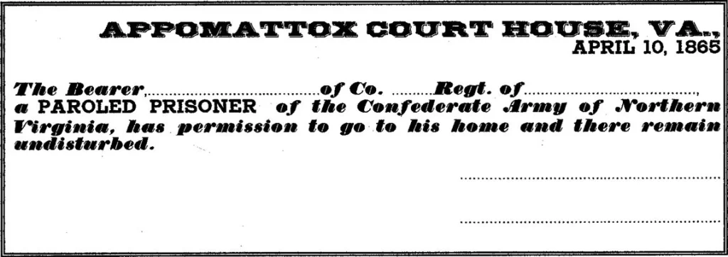 Martin also advised the group that he had an ample number of blank Federal parole forms in his possession. A portable printing press was set up at Appomattox and almost 30,000 parole passes were printed. Some of the parole slips for high-ranking Confederate officers were signed by U. S. Army officers, but slips for most Confederate soldiers were signed by their commanding officers. Reagan requested a sufficient number of parole forms to distribute them to the Confederate officials.