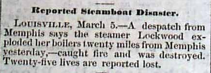 Explosion and Sinking: On March 7, 1866, the steamer Lockwood exploded and burned about eighteen miles below Memphis, Tennessee. Twenty people were killed and twenty-five injured in the incident. The steamboat was valued at $60,000 and was not insured.