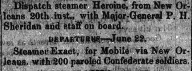 Once they arrived, the Texans enjoyed (5) relaxing days in the city. On Thursday May 18th, 1865 they departed Mobile for New Orleans on the steamer Iberville (see photo at the top of page). The Iberville almost capsized on Lake Pontchartrain but the Texans arrived safely in New Orleans the following day.