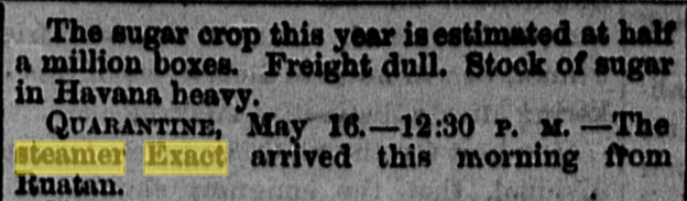 The New York Times had an article that stated “The schooner Saragaway has arrived at Quarantine from Ruatan, with twenty-seven passengers of the wrecked steamer Exact.” The following “Camp & Field” articles are part of a series of 78 columns published in the Holmes County (Ohio) Republican newspaper between February, 24 1881, and August 17, 1882. The articles were written about 20 years after the Civil War by Cpl. Theodore David Wolbach of Company E. Unfortunately, I was unable to find a photograph of the Exact. I’m assuming that it was a vessel similar in style to the Hendrick Hudson.